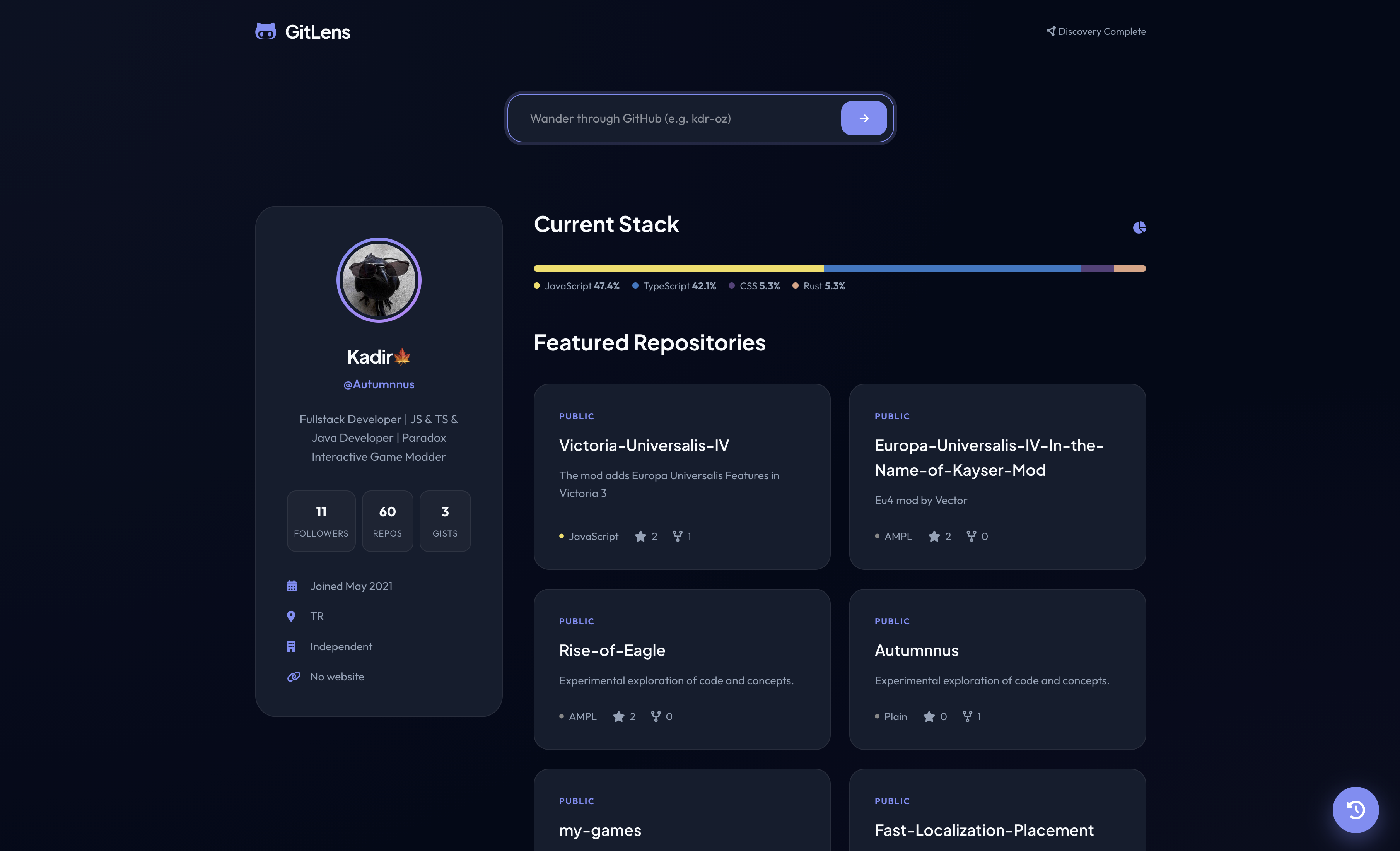 Ortaya kurulum gerektirmeden doğrudan tarayıcıda açılan, sade ama bilgi yoğun bir GitHub profil inceleme aracı çıkmış. Proje küçük ölçekli ama API entegrasyonu, istemci tarafında veri işleme ve modüler JavaScript yapısını net şekilde gösteriyor.